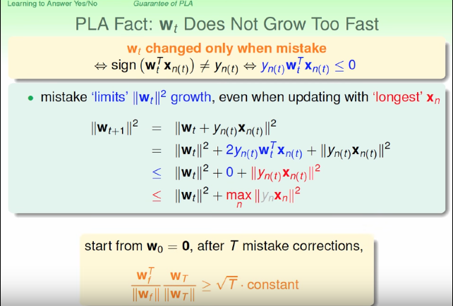 寻求wf和wt之间的关系,向量内积,以下可以表示 wf 和wt之间会越来越接近,通过PLA算法后。